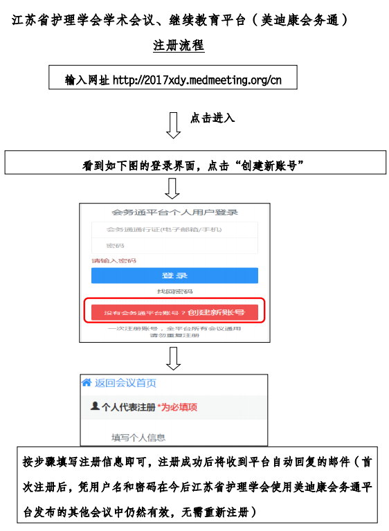 1、报名流程:为做好会务工作、保证培训效果以及安排好学员食宿,请学员登录江苏省护理学会网站(www.jsna.org.cn),从继续教育栏目进入报名平台,也可直接登录学习班网页: http://2017xdy.medmeeting.org/cn,点击“个人用户登录”注册后再报名参加培训,报名成功后将会收到系统自动发送的电子邮件回复(注:首次注册后,凭用户名和密码在今后江苏省护理学会主办的其它会议中永久有效,无需重新注册),具体注册、参会流程请至学会网站“学术活动”栏目下载查阅,如仍无法解决,请致电学会联系人。