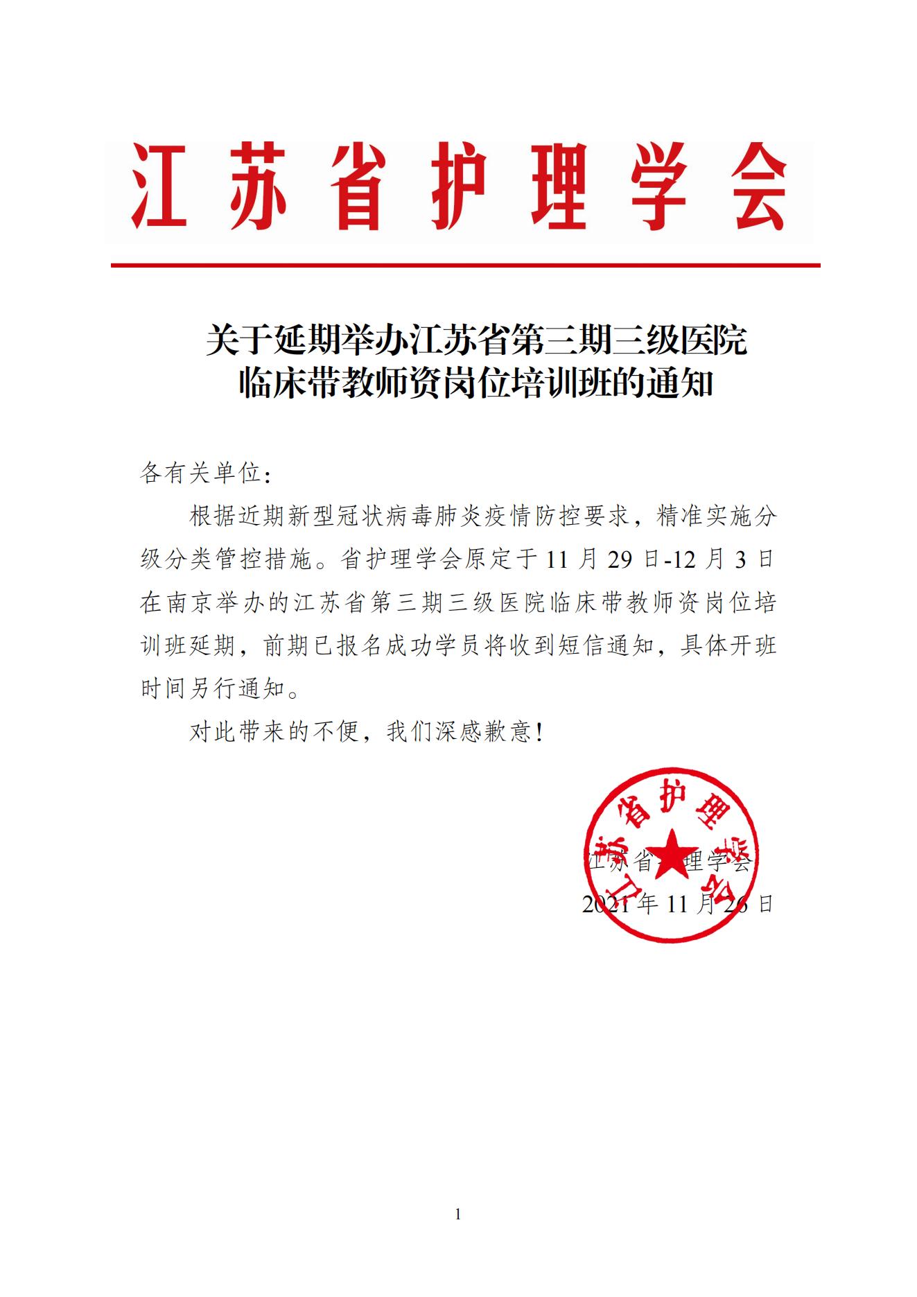 关于延期举办江苏省第三期三级医院临床带教师资岗位培训班的通知
