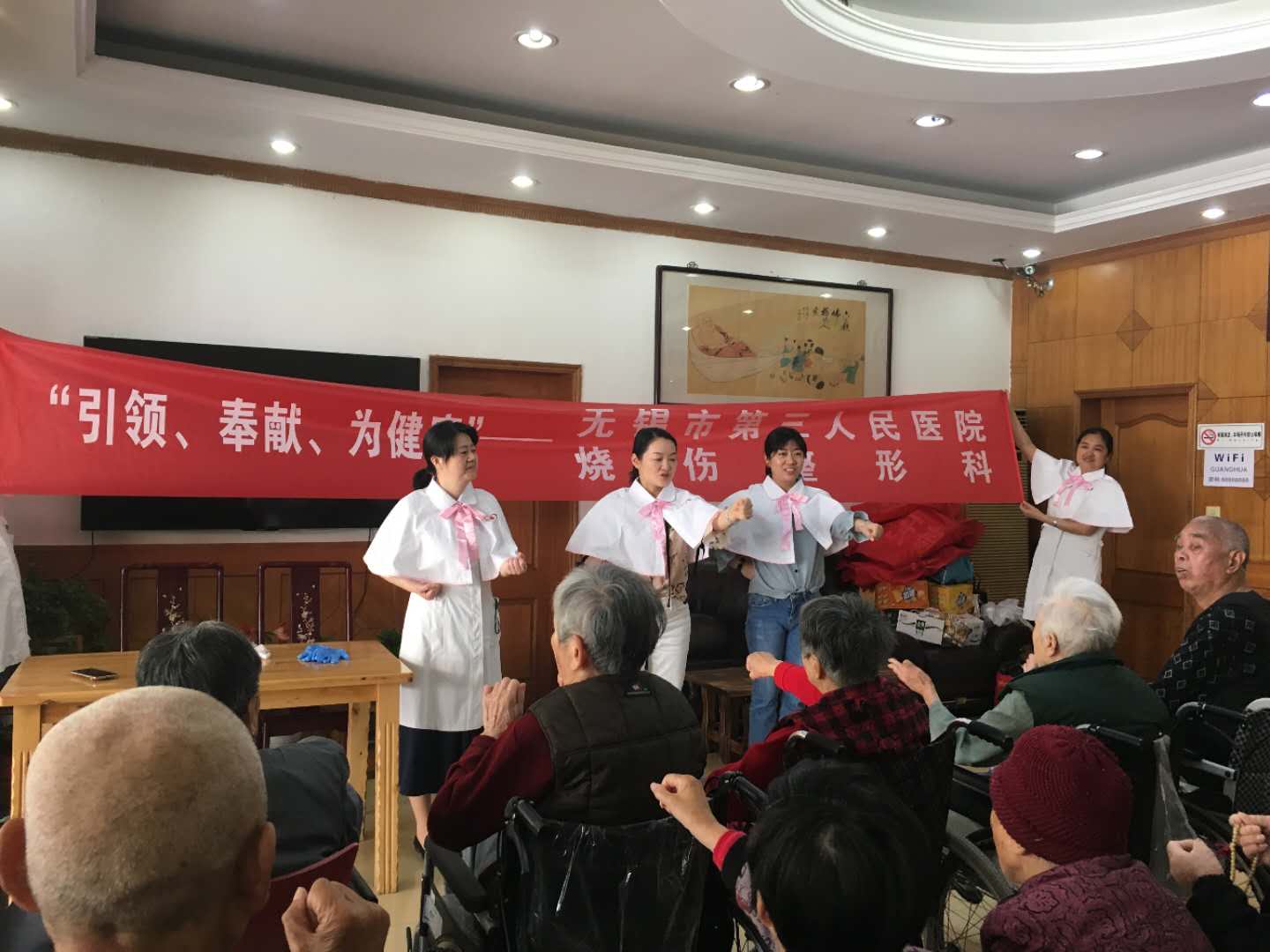2018年5月12日,无锡市第三人民医院烧伤整形科一行十余人组建的护理服务队走进广华福寿院,开展健康教育、指导及查看慢性创面,帮助他们提高健康保健意识,介绍慢性创面护理知识并进行指导。