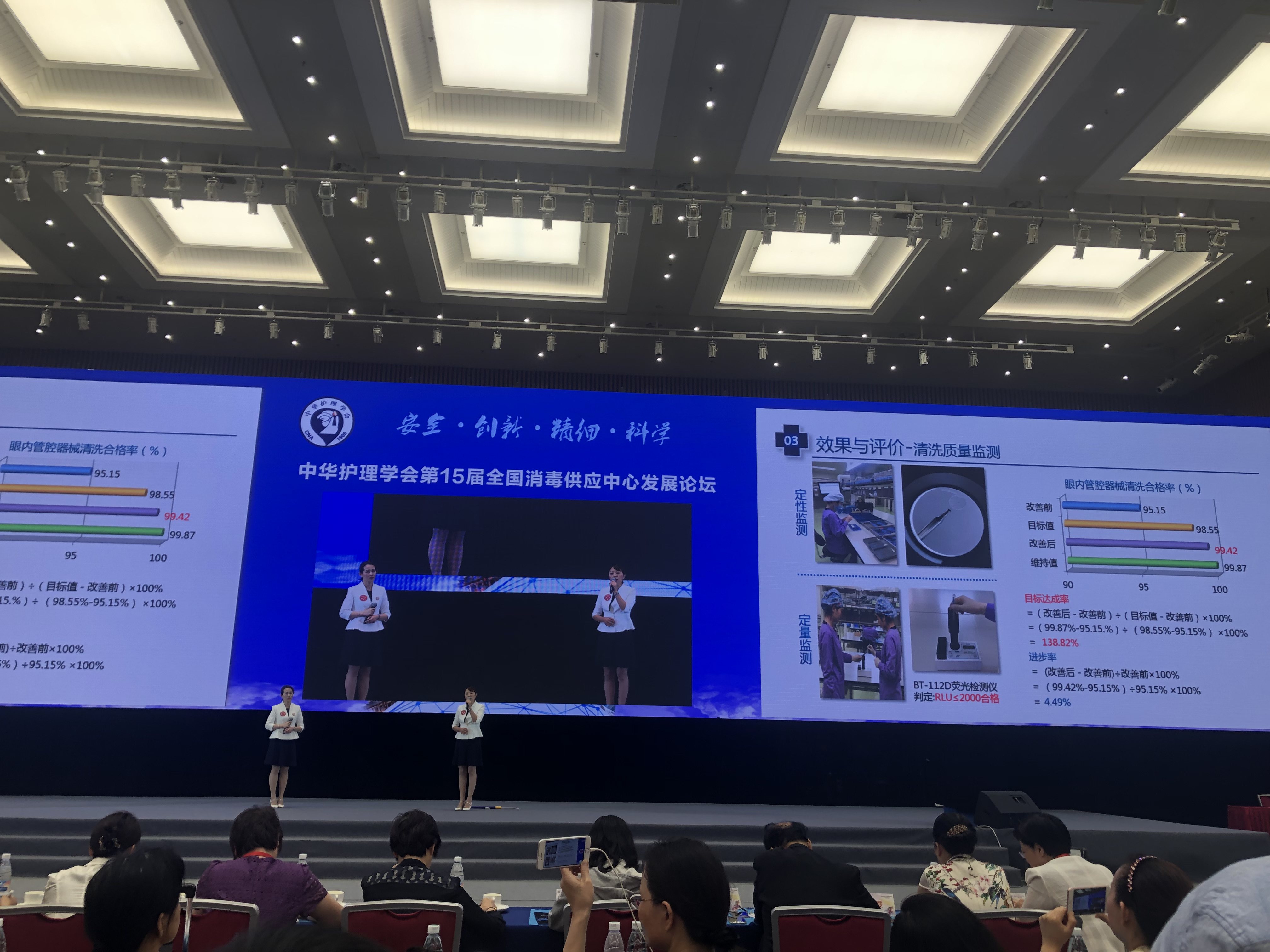 本次大会的压轴巨献是全国《首届专科器械再处理指南最佳实践大赛》总决赛。江苏省人民医院宋瑾、刘芳老师带领的团队,以《匠心筑梦,守护光明——创新思维在眼内管腔器械清洗消毒中的实践分享》,经过南京市、江苏省、北京半决赛历时7个月,一路披荆斩棘,最终代表江苏省进入本次总决赛的十个项目阵容;代表参赛的两位选手汇报从容不迫,铿锵有力,用9分52秒(限时10分钟)将眼科指南最佳实践表现的淋漓尽致,她们的精彩演绎震撼全场!汇报结束时,江苏省参会代表组织的拉拉队沸腾了,横幅、标语贯穿全场,欢呼声、鼓掌声持久不衰!当主持人宣布江苏队荣获一等奖时,带队的刘芳老师情不自禁的留下了泪水,真可谓“台上一分钟、台下十年功”啊!
