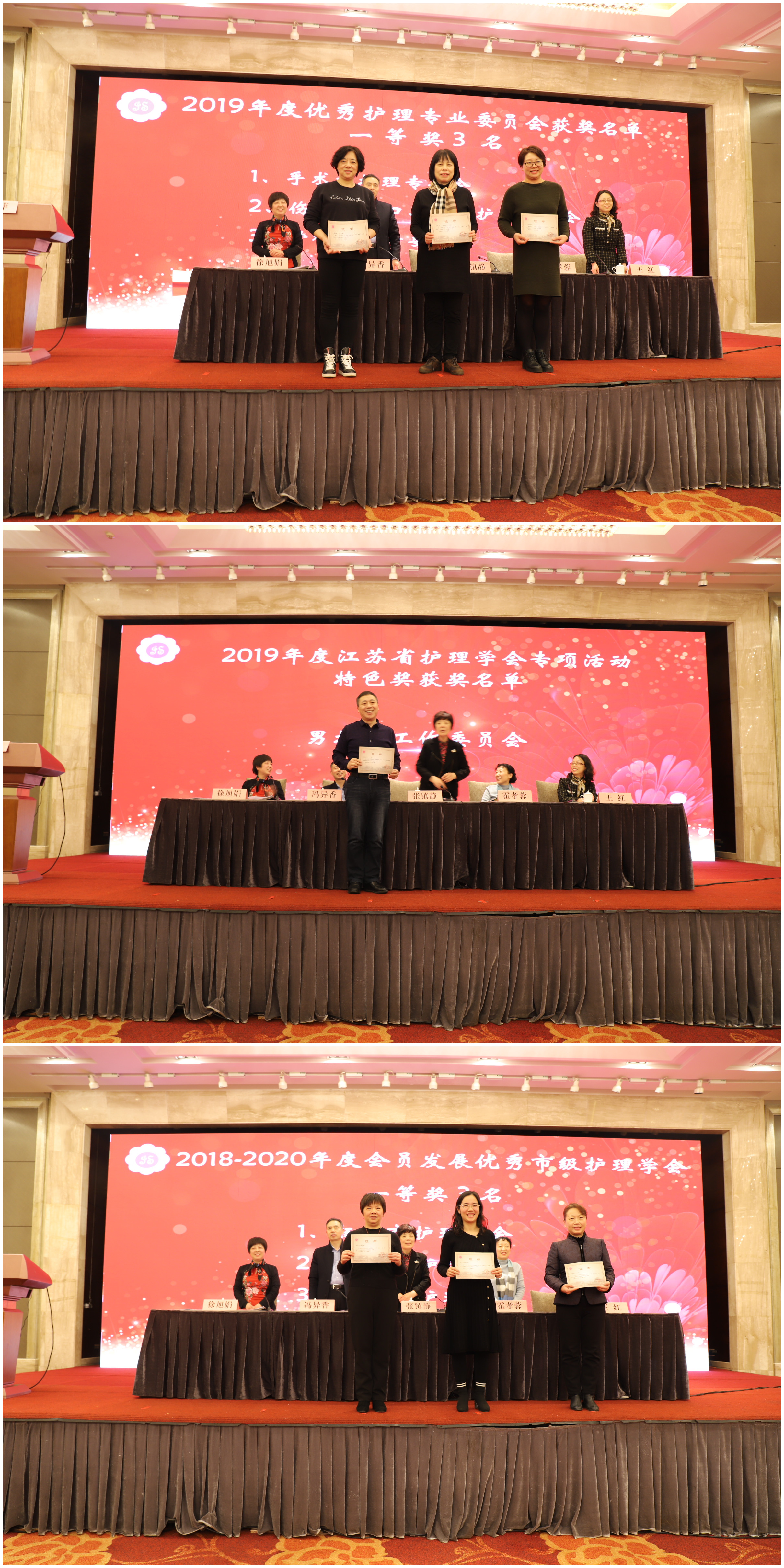 开幕式上表彰了江苏省护理学会“2019年度优秀专业委员会”、“2019年度专项活动特色奖”、“2018-2020年度会员发展优秀市级学会”获奖者。