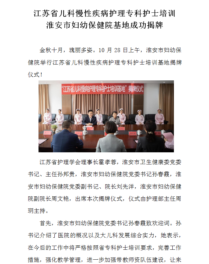 江苏省儿科慢性疾病护理专科护士培训淮安市妇幼保健院基地成功揭牌