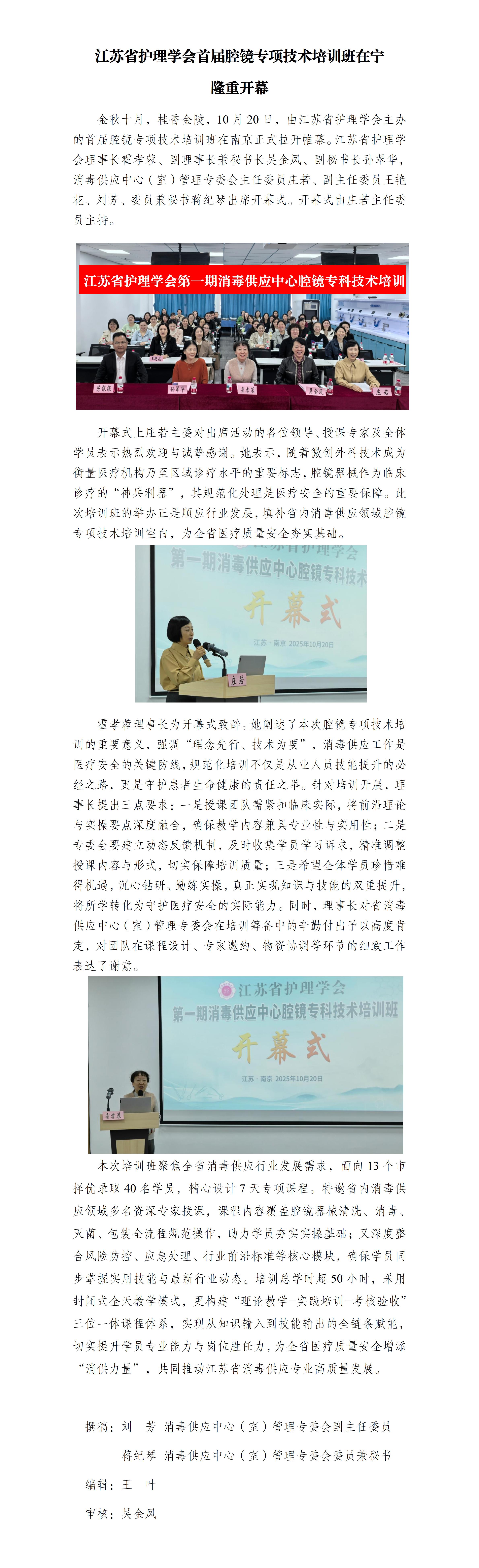 江苏省护理学会首届腔镜专项技术培训班在宁隆重开幕