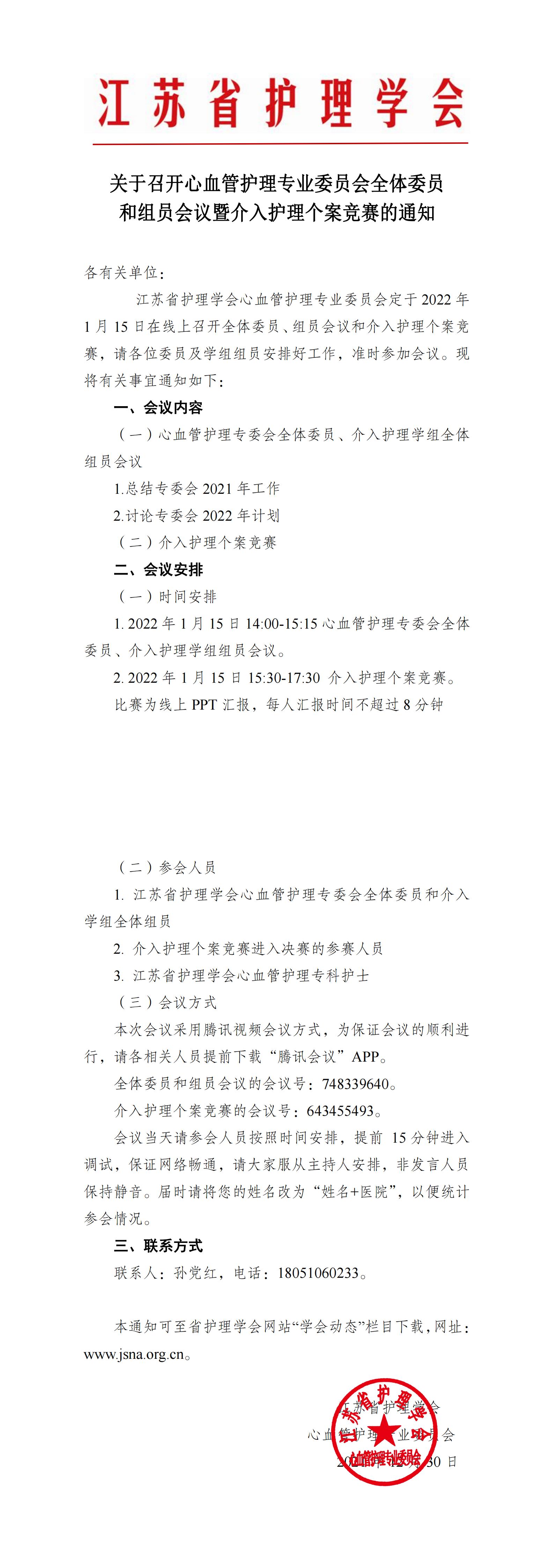 关于召开心血管护理专业委员会全体委员和组员会议暨介入护理个案竞赛的通知