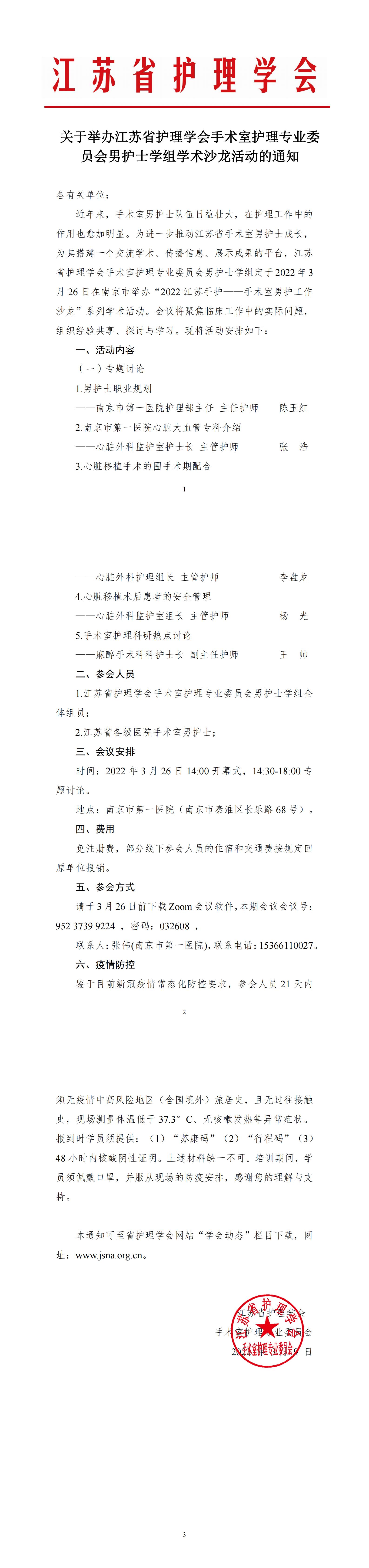 关于举办江苏省护理学会手术室护理专业委员会男护士学组学术沙龙活动的通知