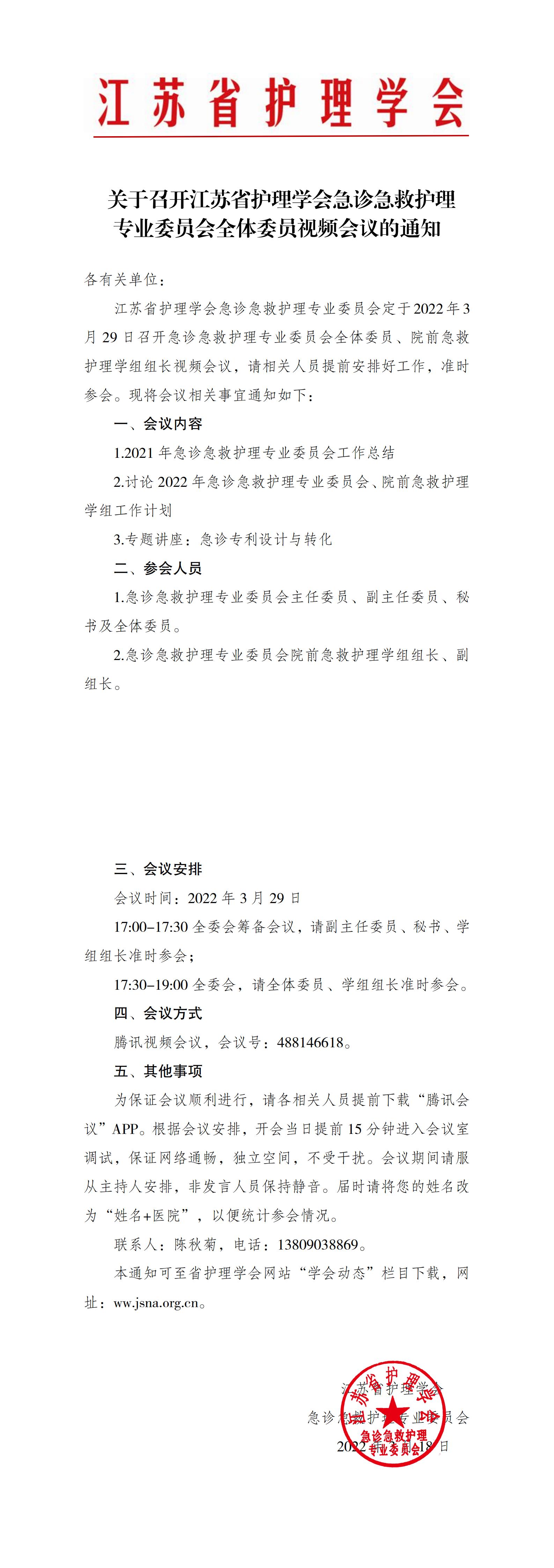 关于召开江苏省护理学会急诊急救护理专业委员会全体委员视频会议的通知