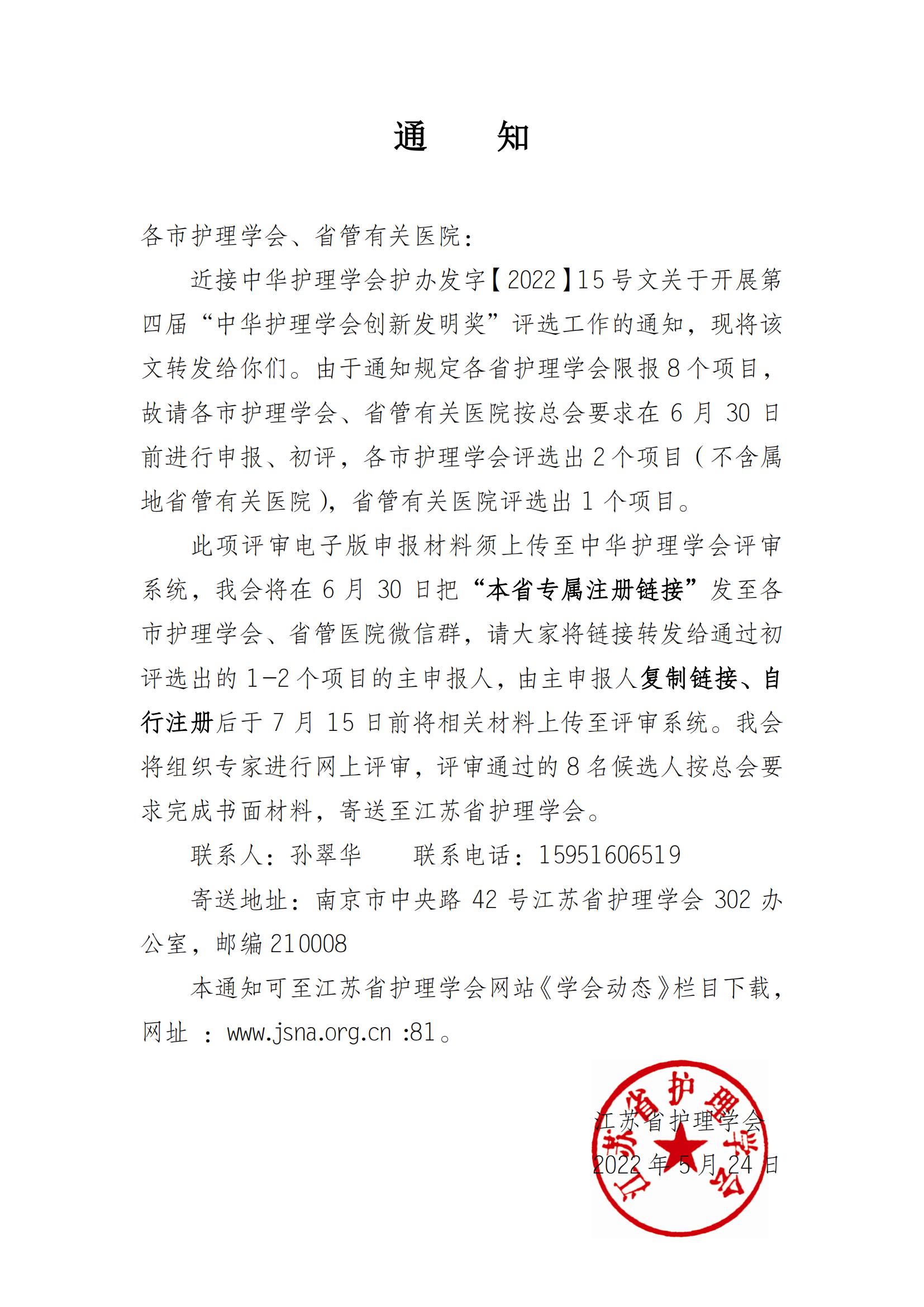 江苏省护理学会转发2022中华护理学会创新发明奖的通知