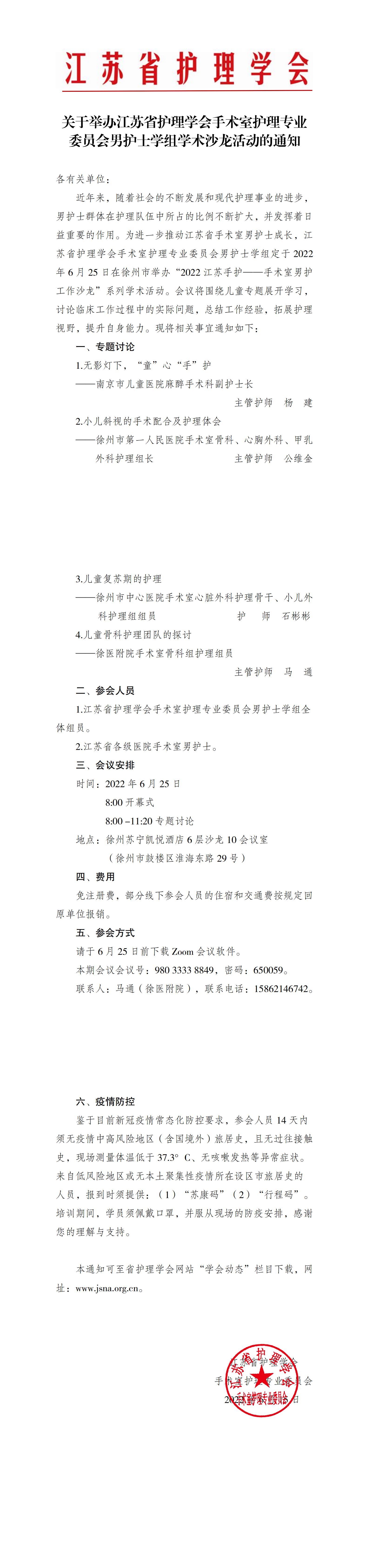 关于举办江苏省护理学会手术室护理专业委员会男护士学组学术沙龙活动的通知