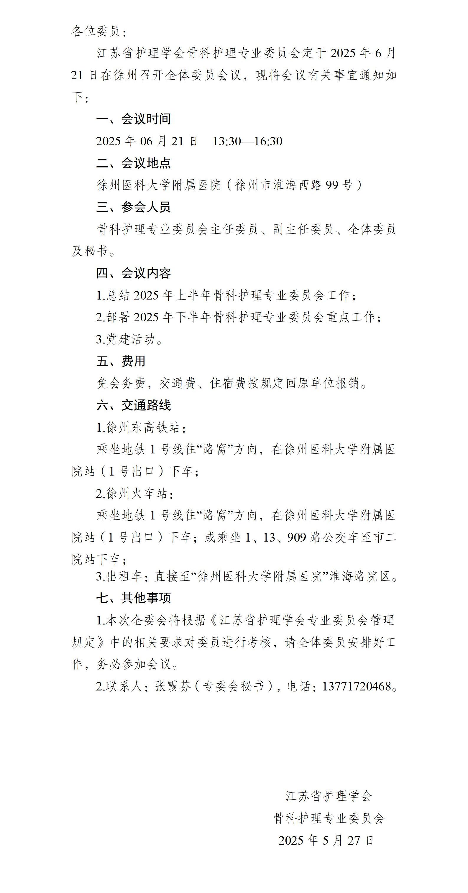 关于召开江苏省护理学会第十届骨科护理专业委员会全体委员会议的通知