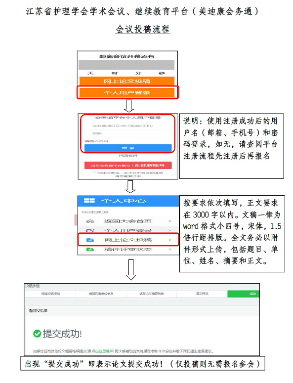 4、投稿方式:为了方便作者投稿和修改,提高会务组的工作效率,此次会议只接收互联网在线投稿,恕不接受书面或电子邮件等其它方式的投稿。请登录江苏省护理学会网站(www.jsna.org.cn),从学术会议专区进入会议网页(江苏省中护理管理学术会议),在该网页点击“网上论文投稿”后按照提示进行用户登录后方可投稿(注:首次登录需先注册,注册后的用户名和密码在今后江苏省护理学会主办的其它会议中永久有效,无需重新注册),投稿时根据提示选择“论文投稿”或“护理质量改善项目”,投稿成功后将会收到网络投稿系统自动发送的电子邮件回执。具体注册、投稿、参会流程请至学会网站“学术活动”栏目下载查阅,如仍无法解决,请致电学会联系人。
