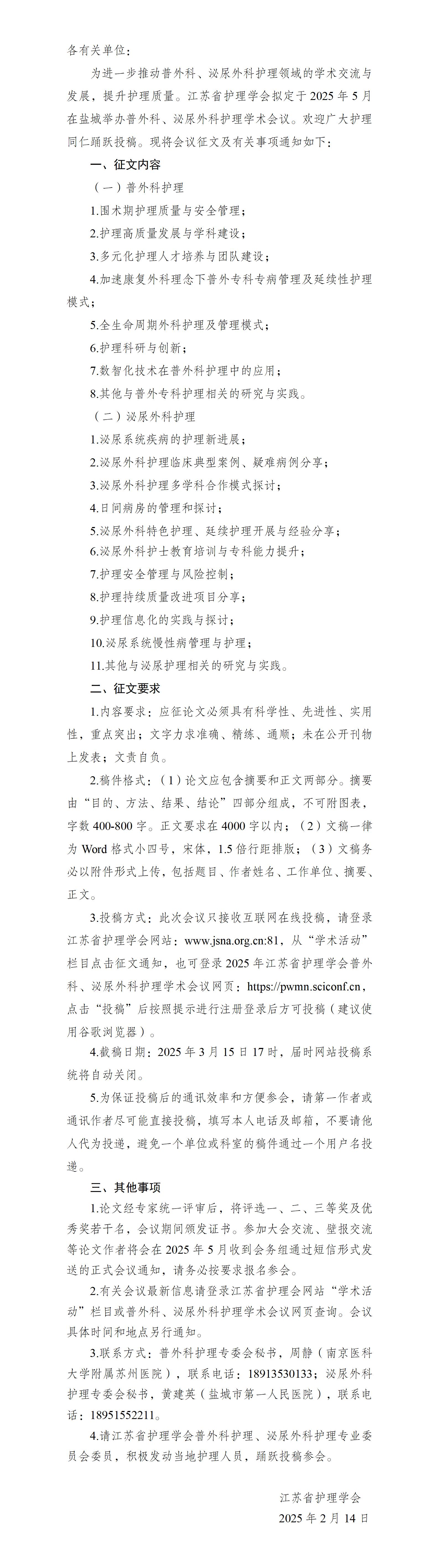 江苏省护理学会普外科、泌尿外科护理学术会议征文通知