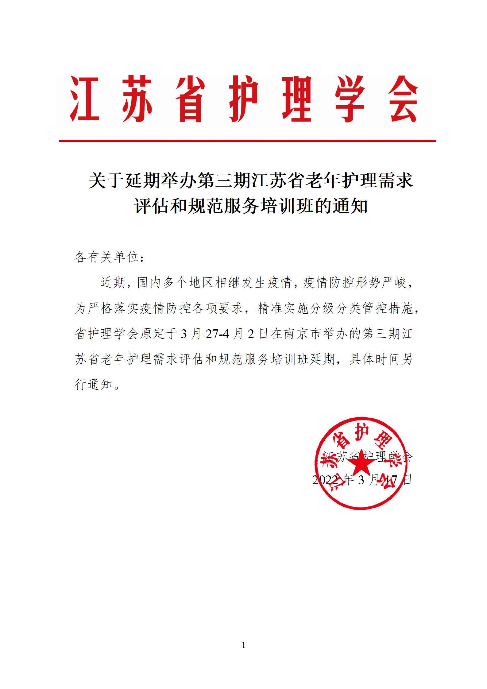 关于延期举办第三期江苏省老年护理需求评估和规范服务培训班的通知