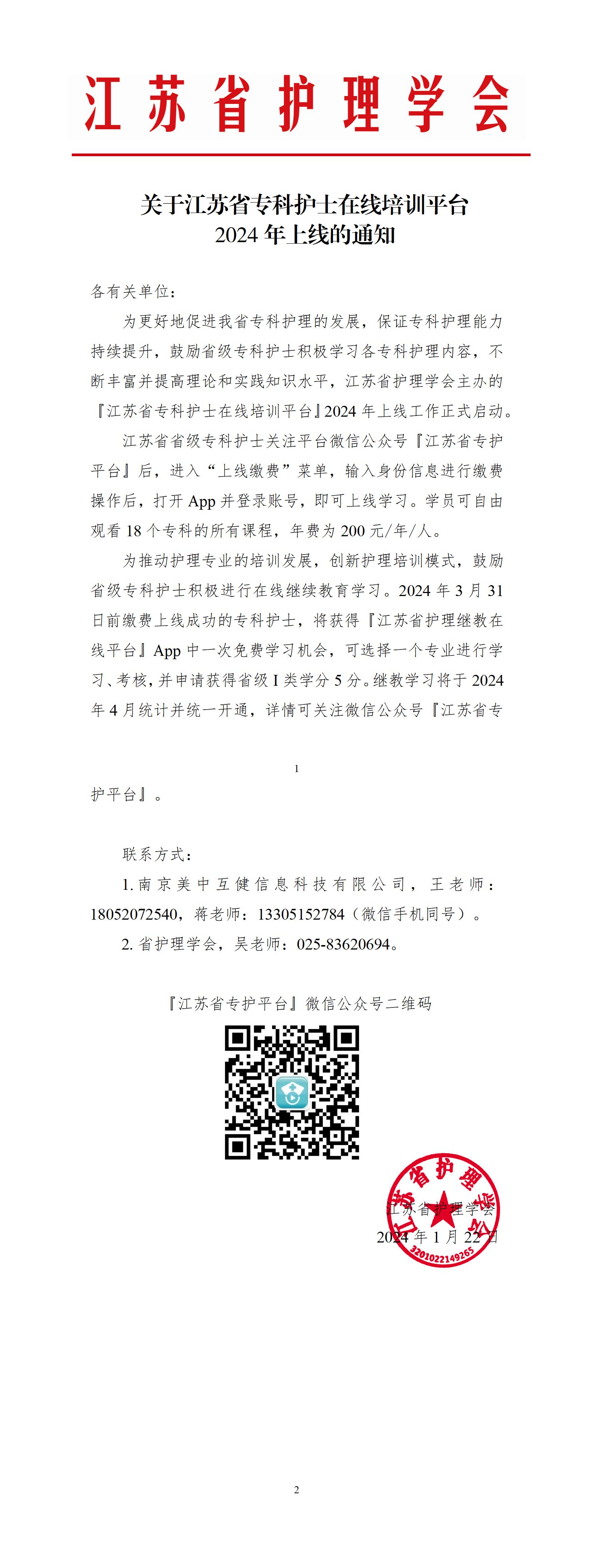 关于江苏省专科护士在线培训平台2024年上线的通知